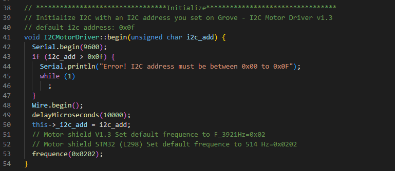 Not much to do here, mainly setting the I2C device address and wait 10ms then set the default frequency for the device… in this case STM32 L298??